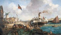 One of the standout pieces shows passengers boarding the Worthing Belle, a cross-Channel ferry steamer, beside the Nelson pub. Although the scene takes us back to the 1880s, it was actually painted in 1966 by Leslie. A. Wilcox. The Worthing Belle was the only ferry service to ever run from Littlehampton, operating between 1863 and 1884 with crossings to Honfleur in France. This painting was purchased with Art Fund support Art Fund.
