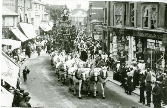 An elaborate procession up the High Street c.1910. Looking at the robed figure riding atop the carriage, the procession may have been part of the town’s celebrations for the Coronation of King George V.